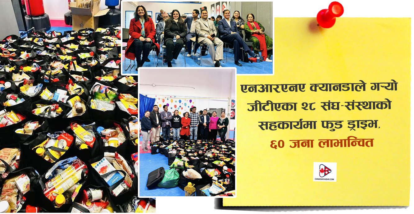 टोरन्टो, क्यानडा — Non-Resident Nepali Association Canada (एनआरएनए क्यानडा) द्वारा आयोजित तथा विभिन्न संघ–संस्थाहरूको सहयोग र सहकार्यमा सञ्चालन गरिएको ‘Delight of Sharing Together’ नामक फुड ड्राइभ कार्यक्रम भव्यरूपमा सम्पन्न भएको छ। कार्यक्रममार्फत ६० जना लाभान्वित भएका छन्।