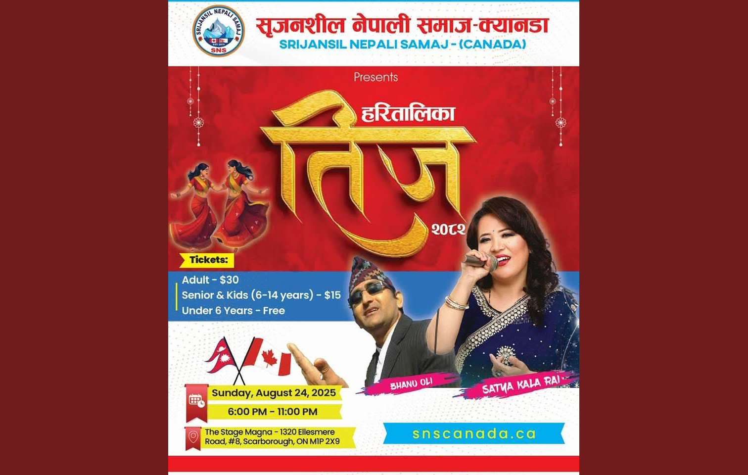 मदन बस्नेत – क्यानडाखबर – टोरोन्टो । हरितालिका तिजको अवसरमा सृजनशील नेपाली समाज क्यानाडा (एसएनएस) ले आयोजना गरेको हरितालिका तीज २०८२: शुभकामना आदान प्रदान तथा नाचगान कार्यकम सम्पन्न भएको...