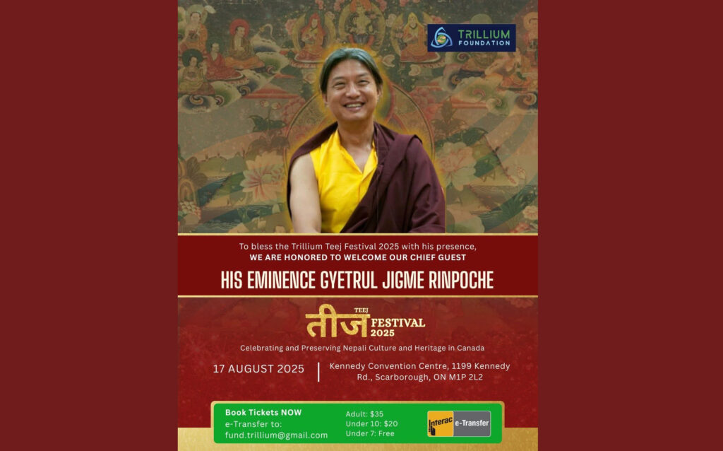 The Trillium Foundation has announced that His Eminence Gyetrul Jigme Rinpoche, a highly revered spiritual leader from Nepal, will be the Chief Guest at the upcoming Teej Festival 2025 in Scarborough. The celebration will take place on August 17, 2025, at the Kennedy Convention Centre, bringing together the Nepali community to honor and preserve its vibrant cultural heritage.