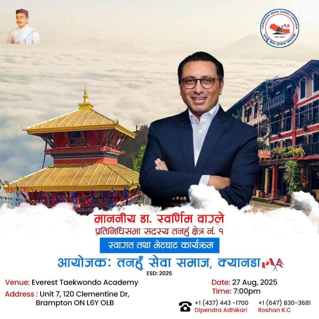 त्यसैगरी तनहुँ सेवा समाज, क्यानाडाले एभरेष्ट टेकवान्डो एकेडेमी ब्राम्पटनमा अगस्ट २७ गते बुधबार साँझ ७ बजे आयोजना गरेको स्वागत तथा भेटघाट कार्यक्रममा सहभागिता जनाउने कार्यक्रम रहेको छ।