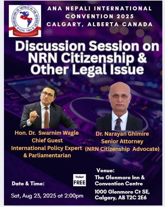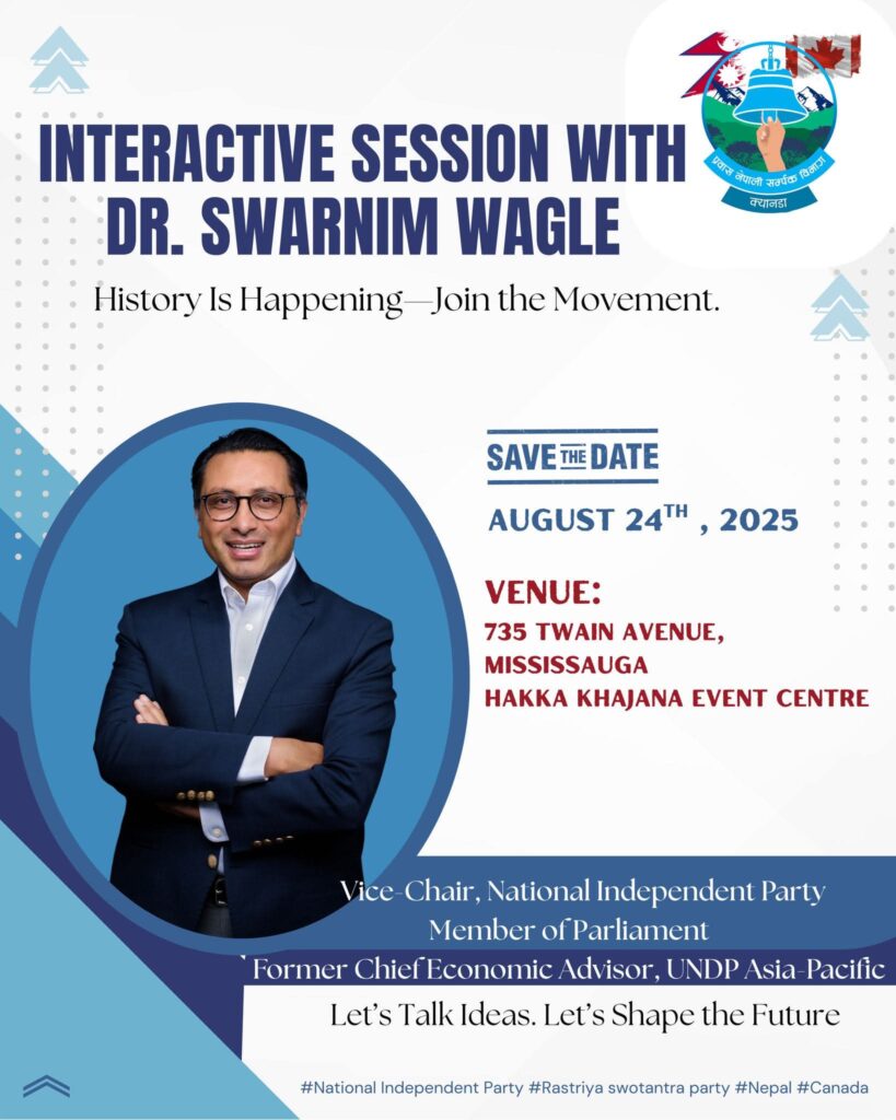 उनले अगस्ट २४ आइतबारका दिन बिहान ११:३० बजे 735 Twain Avenue मिसिसागा अवस्थित हाक्का खजाना इभेन्ट सेन्टरमा प्रवासी नेपाली सम्पर्क विभाग क्यानाडाले आयोजना गरेको अन्तर्कृयात्मक कार्यक्रमलाई सम्बोधन गर्ने छ्न्।