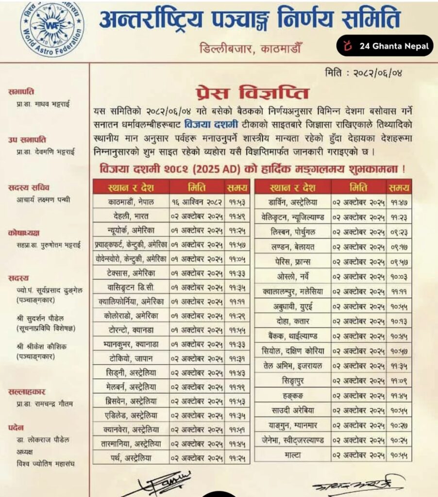 समितिले दिएको साइतअनुसार नेपालको काठमाडौँका लागि असोज १६ गते बिहान ११:५३ बजेको साइत शुभ रहेको छ । यसैगरी देहली भारतका लागि ०२ अक्टोबर बिहान ११:४९ , न्यूयोर्क अमेरिकाका लागि ०१ अक्टोबर बिहान ११:२५ मा साईत छ।