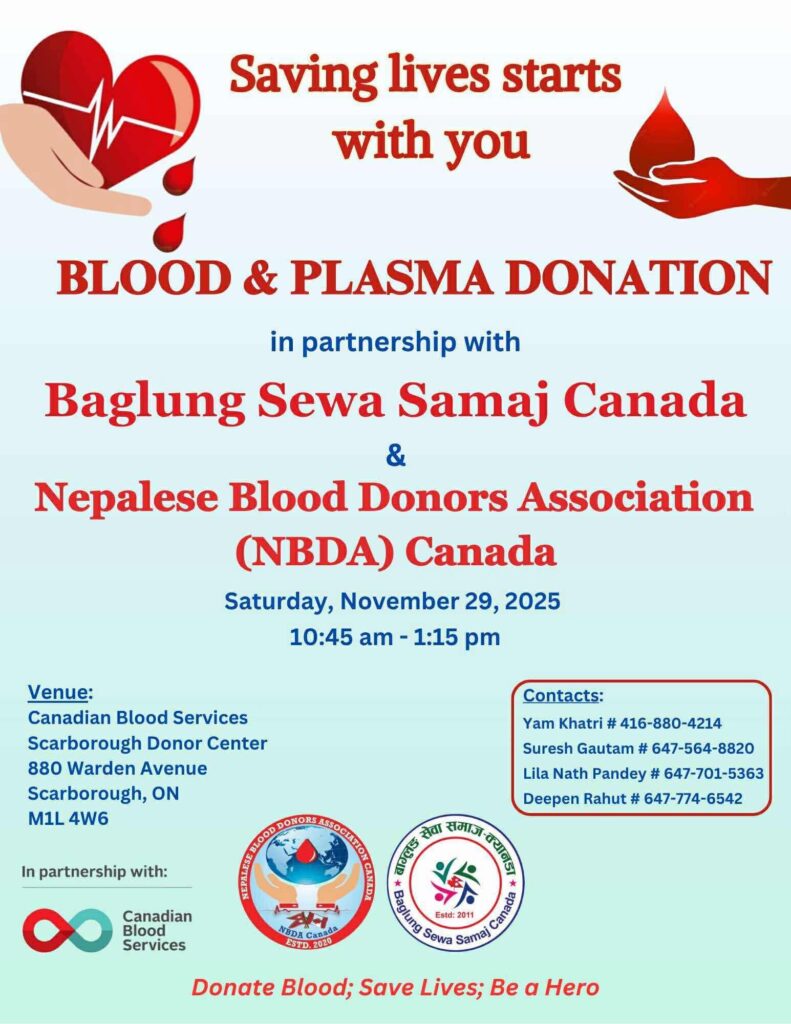 बागलुङ सेवा समाज क्यानडा र नेपलिज ब्लड डोनर्स एशोसिएसन (NBDA) क्यानडाको संयुक्त साझेदारीमा रगत तथा प्लाज्मा दान कार्यक्रम आउँदो नोभेम्बर २९, २०२५ शनिबारका दिन आयोजना हुने भएको छ। कार्यक्रम क्यानडियन ब्लड सर्भिसेज, स्कारबोरो डोनर सेन्टर (880 warden avenue , Scarborough) मा बिहान १०:४५ देखि दिउँसो १:१५ सम्म सञ्चालन हुनेछ।