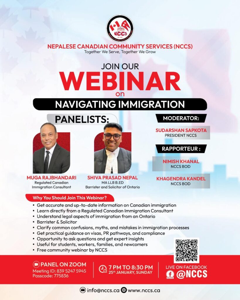Toronto, Canada — In response to the growing need for accurate information and clarity around Canada’s complex immigration system, Nepalese Canadian Community Services (NCCS) is organizing a timely and informative community webinar titled “Navigating Immigration.” The free webinar aims to empower immigrants, students, workers, and families by providing reliable, up-to-date guidance directly from licensed immigration and legal professionals.