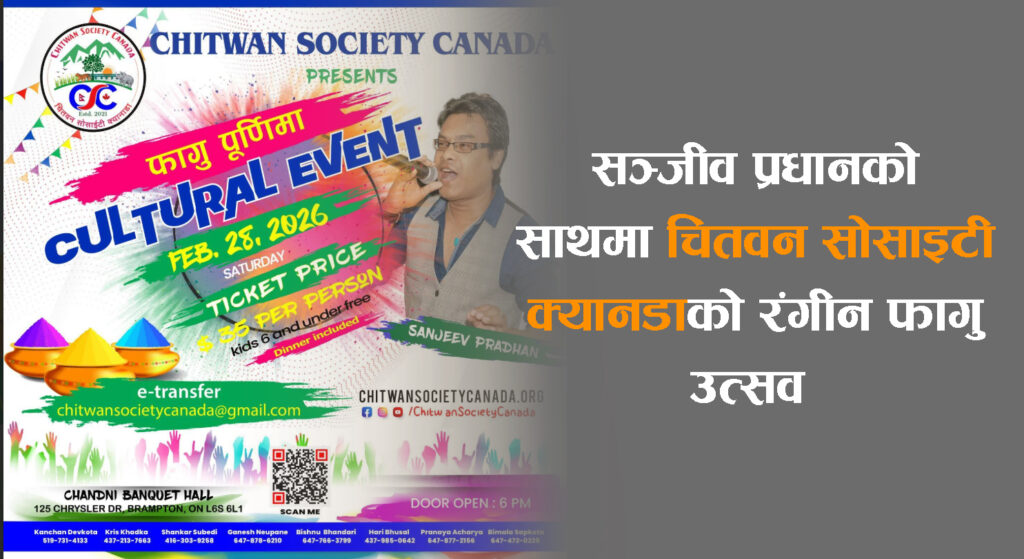 चितवन सोसाइटी क्यानडाले यस वर्ष पनि नेपाली परम्परा र संस्कृति जगेर्ना गर्ने उद्देश्यका साथ फागु पूर्णिमा सांस्कृतिक कार्यक्रम आयोजना गर्न लागेको छ। कार्यक्रम २८ फेब्रुअरी २०२६, शनिबार ब्राम्प्टन स्थित चाँदनी ब्यांक्वेट हलमा हुने छ।