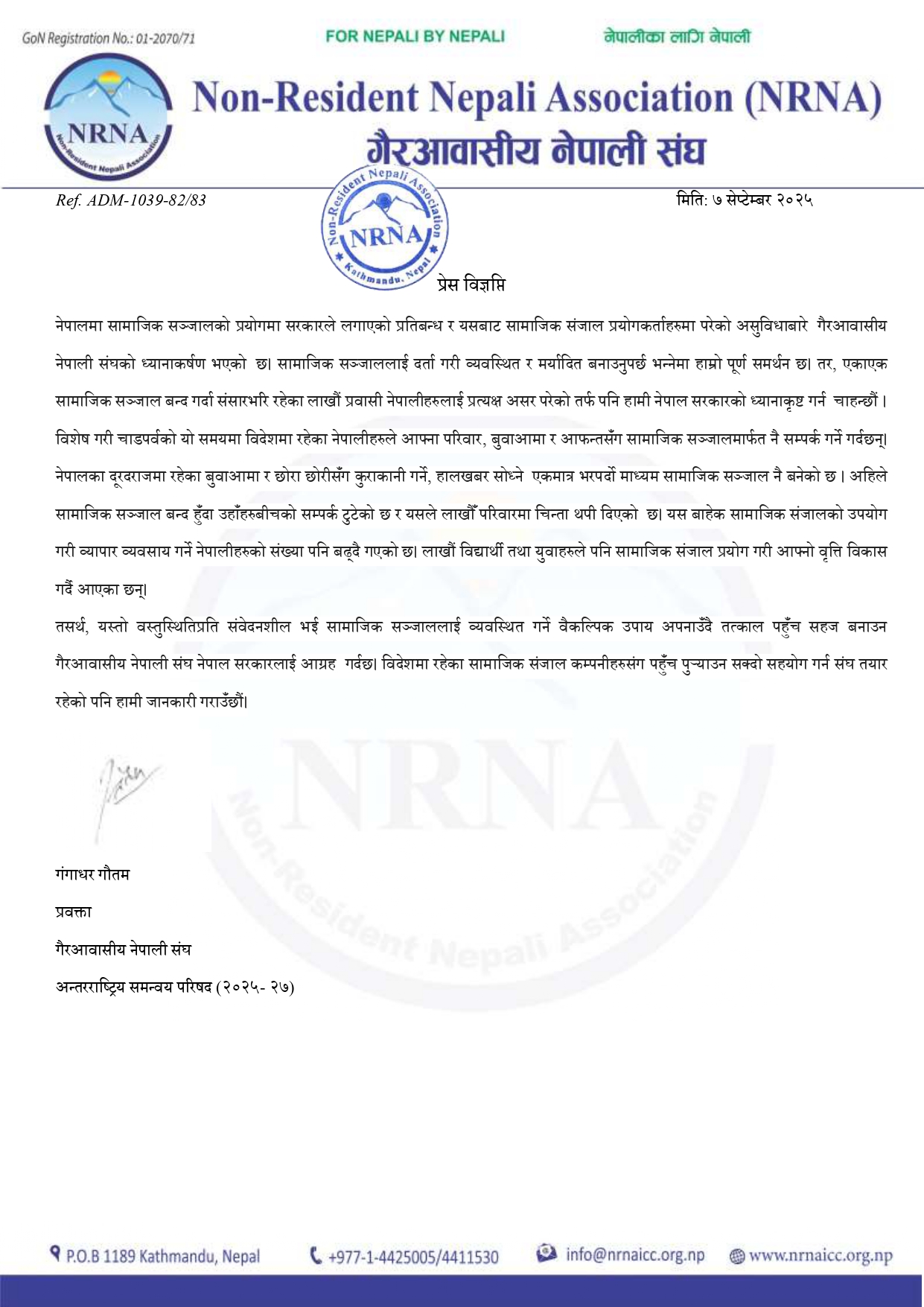 सामाजिक सञ्जालमाथि लगाइएको प्रतिबन्धले लाखौँ नेपाली प्रभावित भएको एनआरएनएको भनाइ