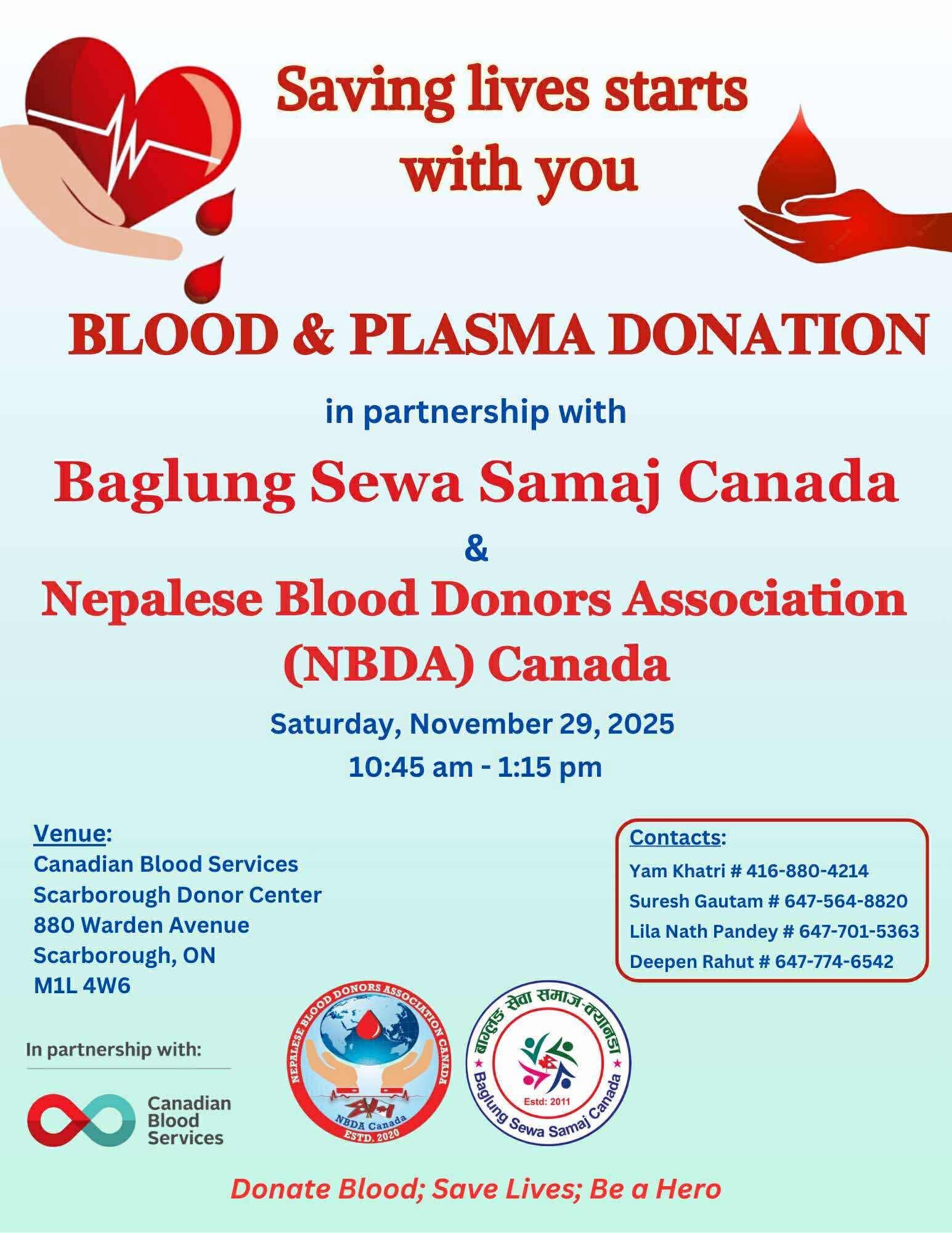 क्यानडाखबर डेस्क । बागलुङ सेवा समाज क्यानडा र नेपलिज ब्लड डोनर्स एशोसिएसन (NBDA) क्यानडाको संयुक्त साझेदारीमा रगत तथा प्लाज्मा दान कार्यक्रम आउँदो नोभेम्बर २९, २०२५ शनिबारका दिन आयोजना हुने...