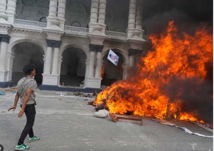 Nepal’s prime minister has resigned as protests against a short-lived ban on social media grew increasingly violent and expanded into broader criticism of his government and accusations of corruption among the Himalayan country’s political elite. Here, a protester throws a photograph of Prime Minister KP Sharma Oli in a fire at the Singha Durbar, the main administrative building for the Nepal government in Kathmandu, Nepal